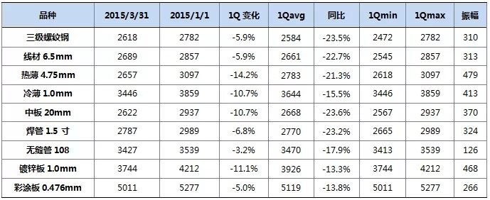 一季度钢价先抑后扬,整体表现偏弱。一季度钢材价格整体较年初明显下降, 季初在原料市场大幅下挫、钢材供给压力较大而需求尚未有效启动的情况下,钢价延续去年以来的下跌态势, 3月中旬开始的反弹行情以京津冀为代表,短短两周时间,北京市场的三级螺纹钢价格涨幅便达到了370元/吨,涨势可谓疯狂,但快速的拉涨必然难以持续,3月底, 钢材现货价格再度出现回调。总体来看,一季度末价格较年初下滑3%-15%不等,其中热轧、镀锌、冷轧、中板几个品种跌幅较大,跌幅均在10%以上。